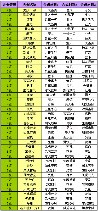 除了4级天书“江南”是由1个3级天书和2个2级天书合成之外,其他天书的遵循以下规律: