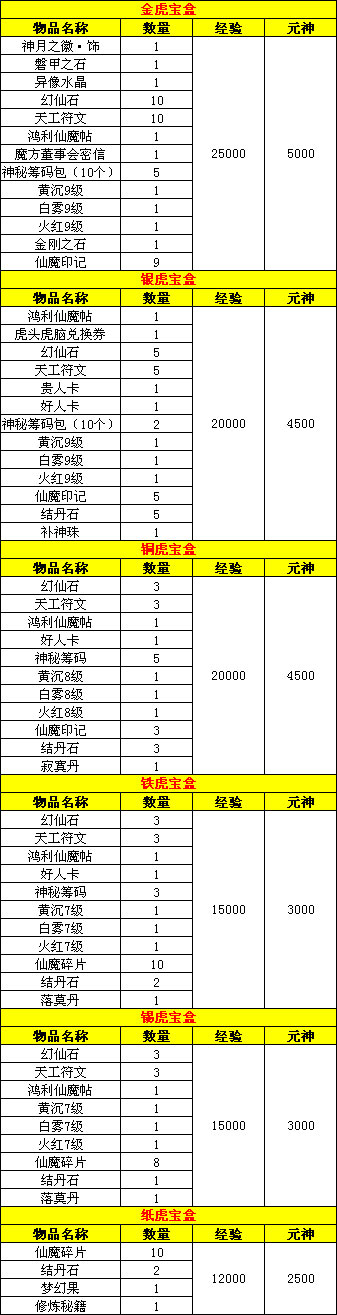 活动期间,每周一晚21点将开启“仙魔劫之仙魔双虎”任务。在四族主城及祖龙城西十字路口处将出现NPC“虎神”,玩家可以向其领取物品“天外伏虎录”,然后凭借“天外伏虎录”再向其领取任务“仙魔劫之仙魔双虎”。活动共分两个阶段:第一阶段需要玩家集体击杀“虎妖喽兵”4999名;第二阶段需要玩家集体击“杀虎刹·仙”、“虎刹·魔”8名。活动过程中,所有参与者共享同一个任务进度。玩家可以在任何阶段加入任务,给每个人绝对自由的参与机会。活动中贡献度越高的玩家,获得高等奖励的机会也就越大,在完成两个阶段后即可到邮筒处领取奖励。