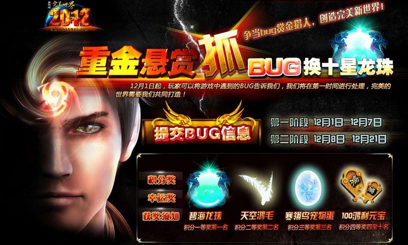 《完美世界国际版2012》体验服为不删档测试服务器,将永久保留玩家的游戏资料。游戏推出的新玩法、新活动、新内容等都将率先在体验服进行测试,并根据各位玩家在体验服游戏过程中发现的BUG、提出的建议和意见来进行修正和优化!12月1日起,玩家可以将在游戏中遇到的BUG告诉我们,我们将在第一时间处理,同时还有丰厚的奖励重赏玩家。碧海龙珠、天空鸿毛、骑宠寒翎鸟、鸿利元宝等奖励BUG赏金猎人,完美的世界需要我们共同打造!